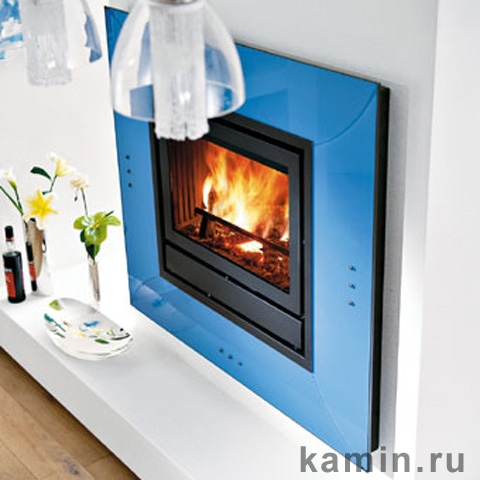 Каминная рамка из закаленного и сериграфированного стекла голубого цвета.